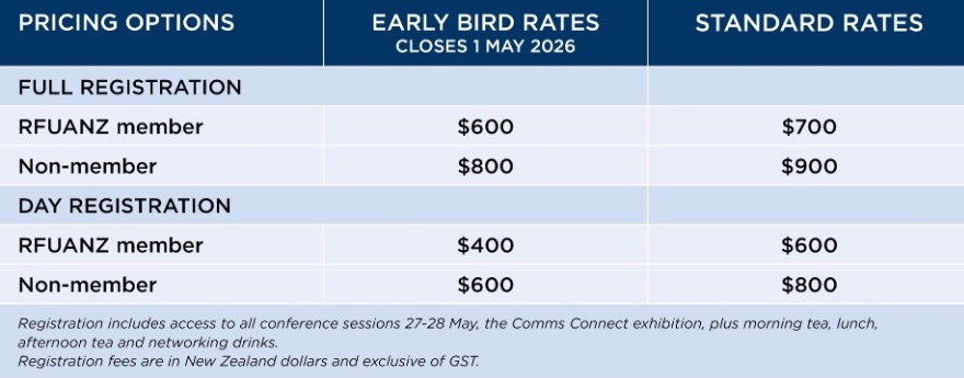 GROUP REGISTRATION: Register 3 delegates for the same registration package and the 4th attends FREE. For large group bookings contact events@comms-connect.co.nz.